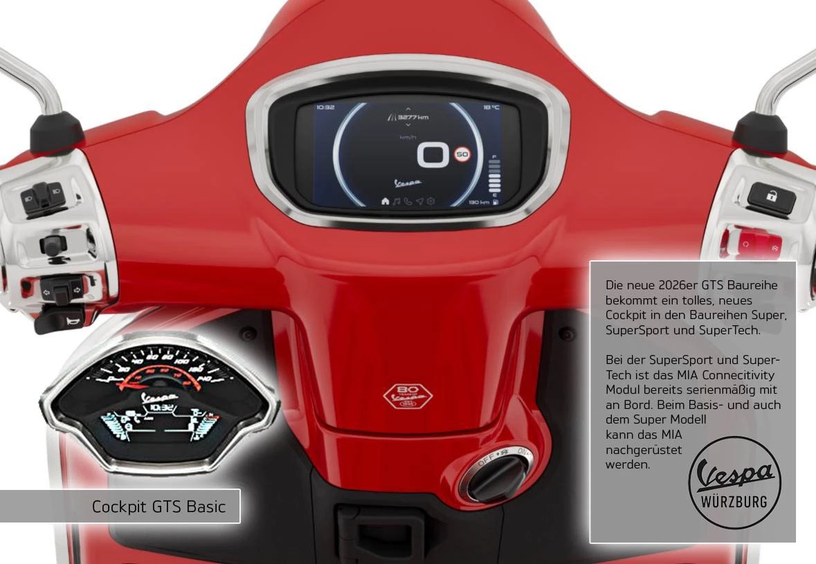 Es gibt Momente, in denen Tradition auf pure Innovation trifft und daraus etwas Einzigartiges entsteht. Die neue Vespa GTS ist die perfekte Synthese aus dem zeitlosen Kultcharakter einer italienischen Ikone und modernster High-End-Technik. Sie ist nicht nur ein Roller – sie ist ein Lebensgefühl, das Freiheit, Eleganz und Dynamik auf die Straße bringt. Ob für die tägliche Fahrt durch die Würzburger Innenstadt oder die ausgedehnte Tour übers Land: Die GTS bietet Fahrspaß auf höchstem Niveau.